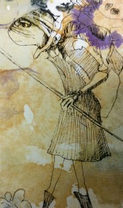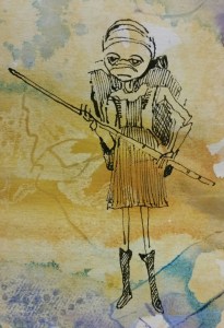 My eyes are always looking for form. It’s kind of like looking for creatures in the forms of the clouds above. One day while walking I saw a little figure, and then another, and another. One figure in particular spoke to me and I later decided to draw her on some stained paper. The side view is the first drawing I made. When I’d done that, I needed to see her from the front.