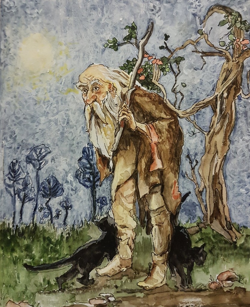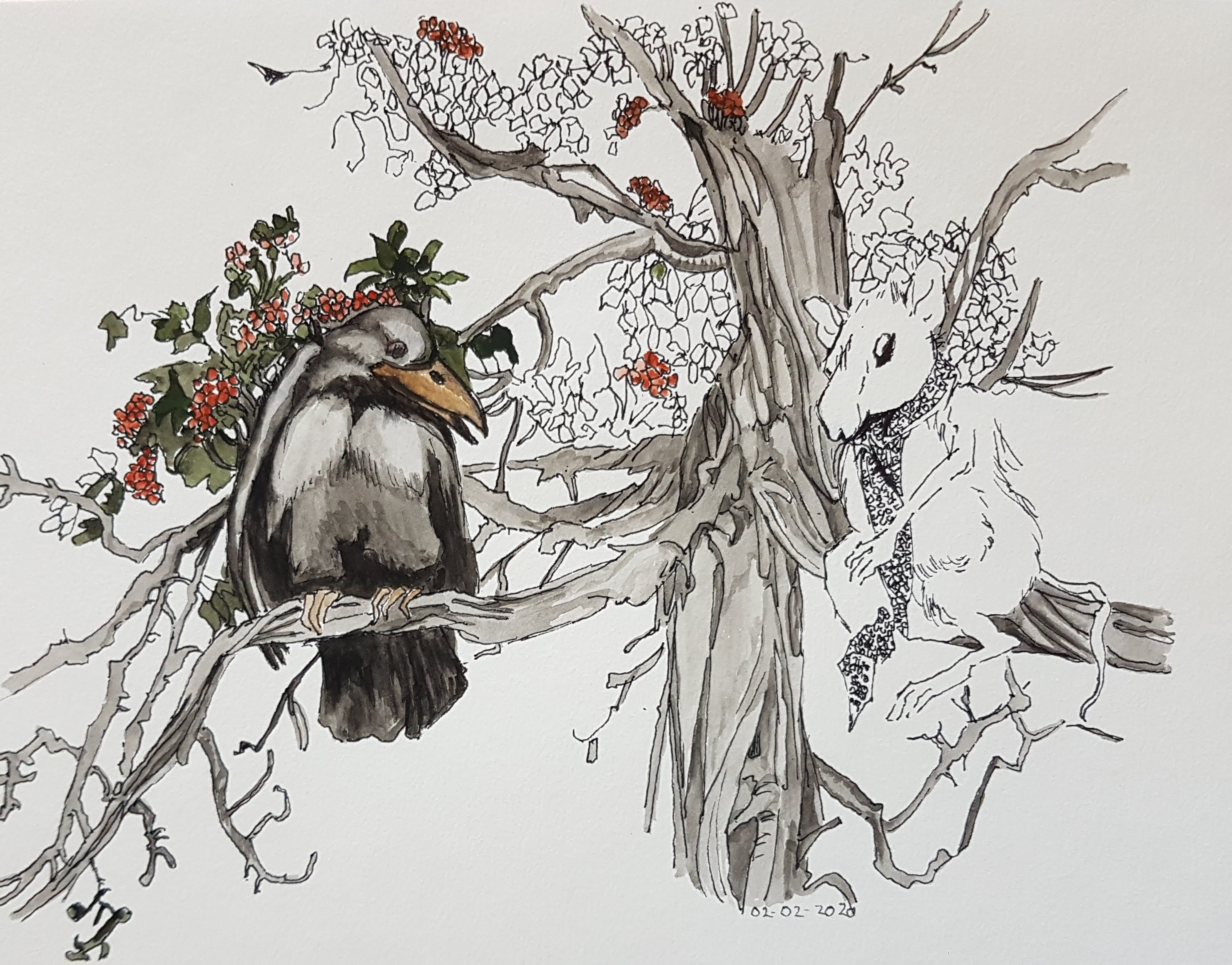I’m past wanting to be considered a serious artist, and I can finally look again at the story illustrations that enthralled me as a kid. I still love them, especially the older, complicated, many-mark kind. Arthur Rackham (1867-1939) pushes all my delight buttons. Above is a drawing I did based on one of his (mine has a rat with a crow, rather than a baby) and then I painted it in gouache, a wonderful medium that sometimes rewards you by creating a glow in your work.