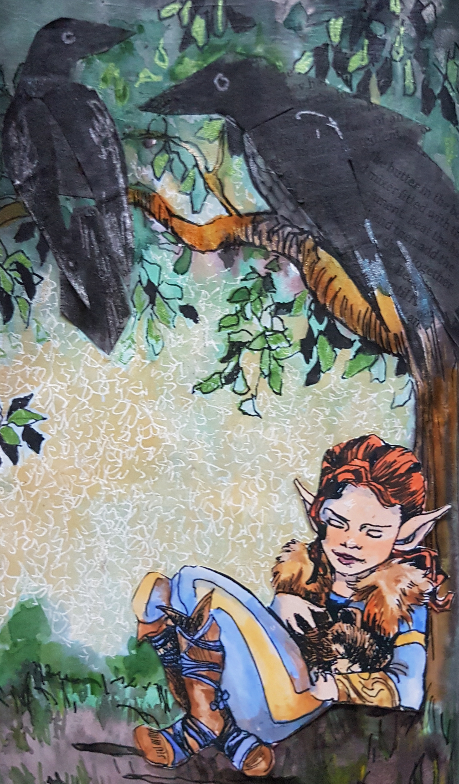 Above are some of the Altered Book pages I’ve been working on. I made a digitial drawing of the ravens a while ago, and then I read Book Two, Child of Dragon’s in the Leather Tales series by Regine Haensel. In this book, Regine features two ravens name Thought, Memory. I love that, and though my ravens don’t have names, it’s nice to think about thought and memory and where they intersect and change each other.